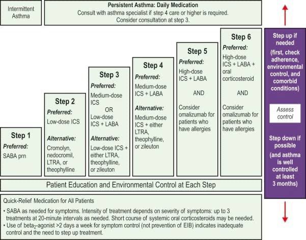 Asthma is the reactive disease of airway that is characterised by the abnormal constriction of airways that is reversible in nature. The following chart demonstrates stepwise treatment plan of asthma according to the response.