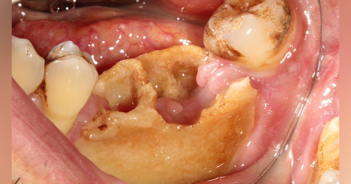 The osteonecrosis of the jaw can occur as a result of disrupted blood supply. Processes like radiotherapy, medications with tendency to disrupt blood flow, high-dose steroid therapy, and disruption in bone turnover can implicate in osteonecrosis of the jaw. Medication associated with risk of osteonecrosis of the jaw are listed as under: - Pamidronate - Alendronate - Risedronate - Ibandronate - Zoledronic acid - Clodronate - Denosumab - Tiludronate - Imatinib - Bevacizumab - Sorafenib - Etidronate - Sunitinib Reference: https://www.nature.com/articles/s41413-020-0088-1 Image via: https://www.rdhmag.com/pathology/article/14197577/risks-of-medicationrelated-osteonecrosis-of-the-jaw-in-cancer-patients