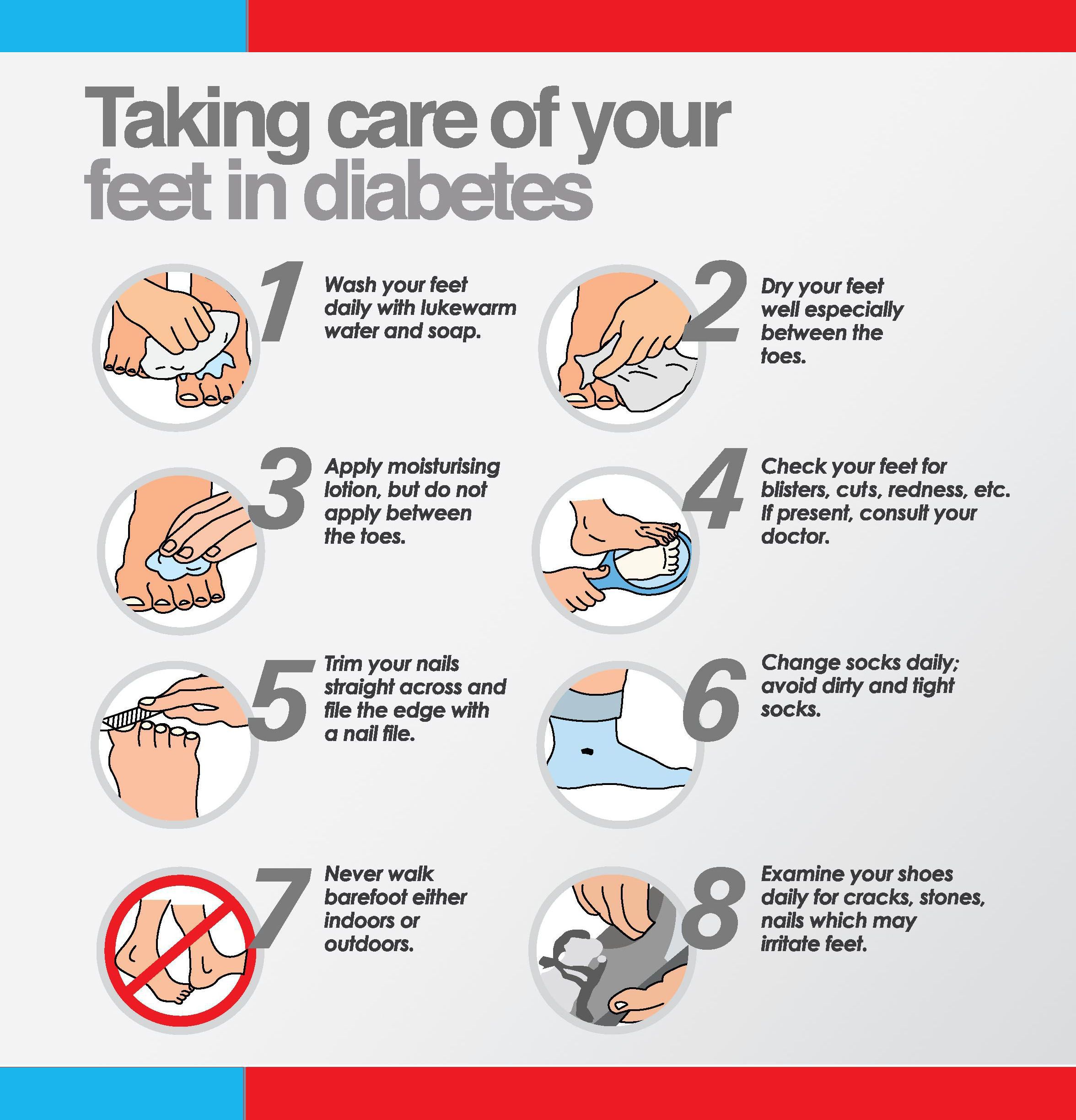 The above provided image mentions some important and concise pointers that need to be taught to a patient at risk for or treated for diabetic foot. If these precautions are followed the complication of diabetic foot can be avoided. Image Source: https://www.pinterest.com/pin/14214555044700156#imgViewer