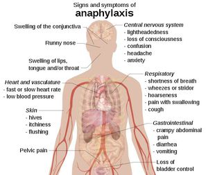 [ Requires First Aid ]. Anaphylaxis is a life-threatening condition in which the airway can become constricted and the patient may go in shock. The reaction can be caused by a systemic allergic reactions to allergens such as [Insect Bites & Peanuts]. Anaphylaxis is treated with injection of (epinephrine)