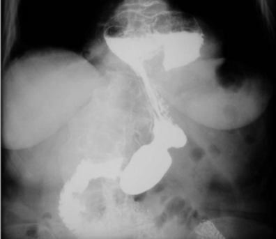 Hiatal hernia refers to protrusion of abdominal contents into the thorax secondary to dilation of esophageal hiatus in diaphragm. There are two types of esophageal hiatal hernia i.e., sliding hiatal hernia and paraesophageal hernia. Sliding hernia is also known as type I hiatal hernia. It is more common than the paraesophageal hiatal hernia. On radiology, it gives a typical ‘hourglass apperacne’. Reference: https://clinicalanatomy.com/mtd1/334-esophageal-hiatus-hernia Image via: https://slideplayer.com/slide/4720524/