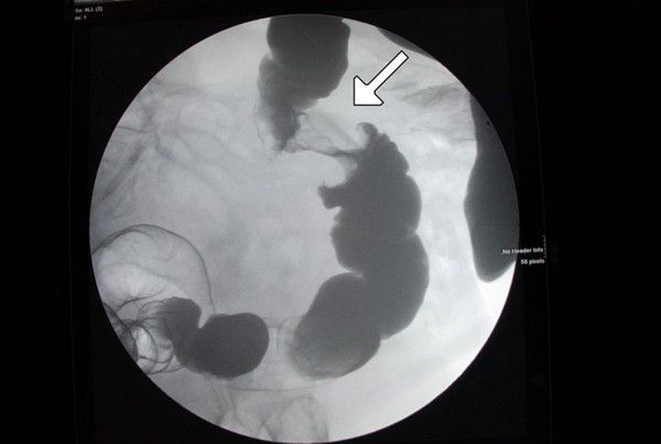 Apple core sign is a characteristic finding in stenosing annular colorectal carcinoma. The typical appearance is attributed to constriction of lumen. It is also known as ‘napkin sign’. In addition to colorectal carcinoma, apple core sign may also be present in case of Crohn’s disease, ulcerative colitis, ischemic colitis, lymphoma, tuberculosis, and villous adenoma. Reference: https://radiopaedia.org/articles/apple-core-sign-colon-1 Image via: https://www.researchgate.net/publication/38094336_Apple-core_lesion_of_the_colon_A_case_report/figures?lo=1&utm_source=google&utm_medium=organic