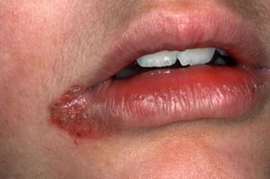 inflammation of one or both corners of the mouth. Often the corners are red with skin breakdown and crusting. It can also be itchy or painful.