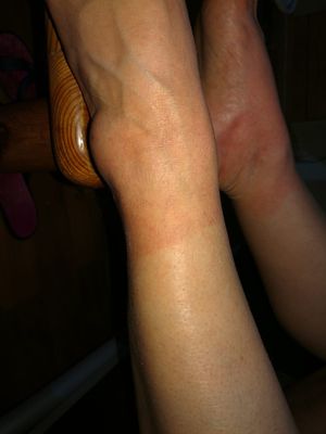 55-year-old woman presents a clear blush at the ankles or above the knee that lasts at most two days then disappears completely. No itching or burning, just warm to the touch. Skin not irritated. Sudden onset not resulting from the use of socks or trousers. Sometimes she feels suddenly very tired.