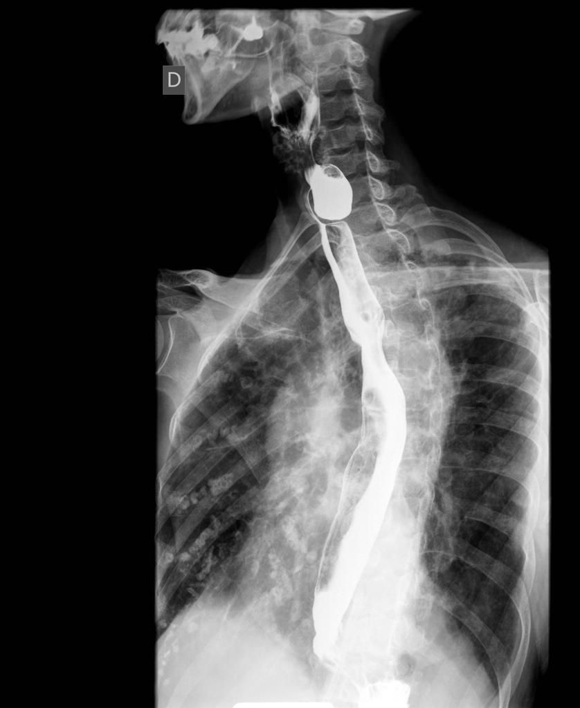 A zenker diverticulum is a pseudo-diverticulum characterized by outpouching of hypopharynx through Killian’s triangle secondary to weakness of muscles. The patient presents with complaints of dysphagia, regurgitation, and halitosis. The barium swallow examination is indicated to diagnose zenker diverticulum. The radiological finding suggesting presence of Zenker diverticulum are: - A diverticulum arising near the pharyngo-esophageal junction. - Outpouching on swallowing at level of C5 and C6. Reference: https://radiopaedia.org/articles/zenker-diverticulum-1 Image via: https://radiopaedia.org/cases/zenker-diverticulum-1