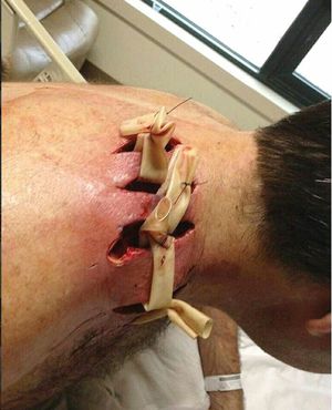 This person was bitten by a spider ,but little did he know that it had been a recluse spider! Leaving it untreated allowed the venom to cause these lesions . Scientists say this venom contains a rare protein that can cause a lesion as well as a much less common, but more dangerous systemic reaction in humans.. The most common response is inflammation, which ,aftr one to two days can develop into a "dark lesion" surrounding the bite site. The blackining, or " necrosis" ,of the skin is dead skin cells, evidence of the immune systems effort to prevent the spread of the toxin by preventing blood flow to the affected area.