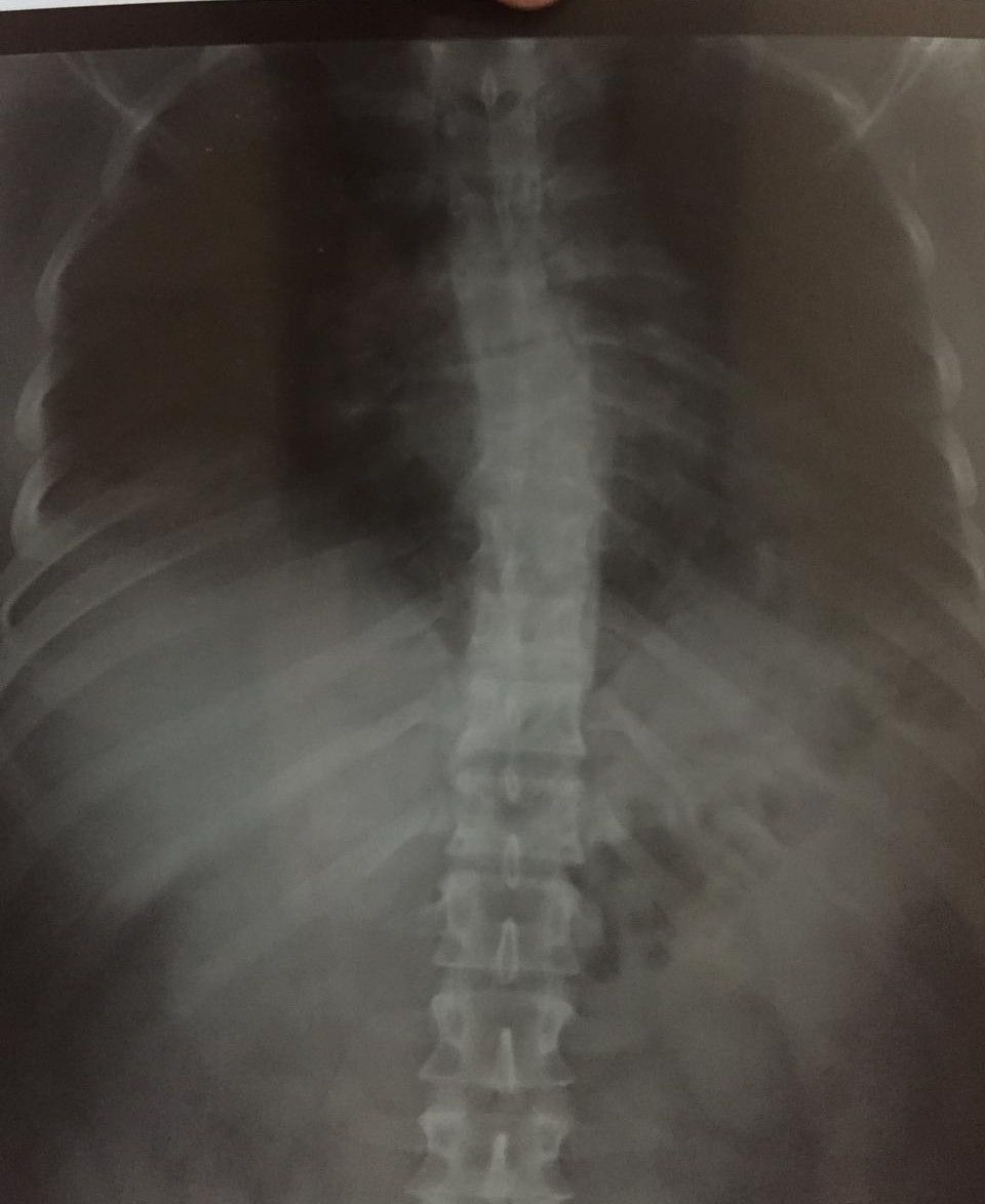 T566 Inter vertebral space obliterated Scoliosis+. Trivial TB vertebrae