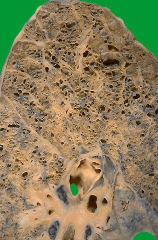 The attached image demonstrates the gross appearance of the lung. In emphysema, the lung spaces enlarge irreversibly secondary to alveolar damage. Reference: https://webpath.med.utah.edu/LUNGHTML/LUNG057.html
