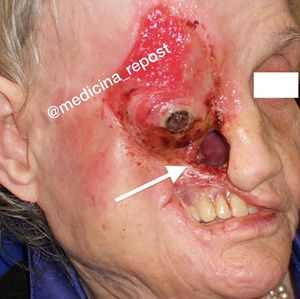 Trigeminal trophic syndrome is a rare disease resulting from injury to the trigeminal nerve. It is characterised by par- and anaesthesia leading to self-manipulation and ulcerative lesions in the trigeminal area. Differential diagnoses are malignancies as well as infectious and autoimmune diseases. Our case presents a severe form of trigeminal trophic syndrome as a late complication of sub-occipital vestibular schwannoma extirpation. An 84-year old female patient presented to our clinic complaining of progressive loss of vision on the right eye. Over 20 years ago, she had had a right-sided vestibular schwannoma extirpated via a sub-occipital approach with simultaneous ventriculoperitoneal shunt placement. Several years later, the patient started to complain of par- and hypaesthesia resulting in a habit of repetitive self-manipulation within the trigeminal area. The self-manipulating behaviour had been aggravated over the past years due to progress of a dementia syndrome. On physical examination, an extensive right-sided facial defect could be seen affecting the upper lip, cheek, ala nasi, the eyeball as well as the right forehead. Furthermore, after ophthalmologic consultation, right-sided amaurosis was diagnosed. After a gerontopsychiatric evaluation, the patient was initialised on medical therapy with sertraline and carbamazepine. Simultaneously, local wound cleaning and an intravenous antibiotic therapy were performed for infection prophylaxis. Possibly aggravated by the dementia syndrome, self-manipulation continued despite conservative measures, leading to progress of the facial defect with complete destruction of the eye ball. For that reason and due to the high risk of infection with potential intracranial spread, it was decided that a surgical wound debridement with exenteratio orbitae be performed. Closure of the large surgical defect required a large tissue bulk. Therefore, a free vascular flap transfer was performed in collaboration with the department for plastic and reconstructive surgery using an anterolateral thigh ALT flap with vascular anastomosis to the ipsilateral facial artery.