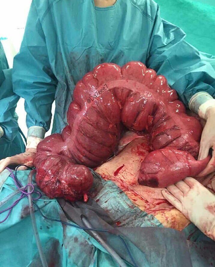 Acute colonic pseudo-obstruction (Ogilvie's syndrome) is a disorder characterized by massive dilatation of the colon in the absence of an anatomic lesion that obstructs the flow of intestinal contents. It is a type of megacolon which is sometimes referred as acute megacolon. Unlike toxic megacolon, it may occur after surgery specially following coronary artery bypass surgery ,and total joint replacement. Drugs that disturb colonic motility like anticholinergics or opioid analgesics contribute to the development of this condition. The image shows total colectomy and ileostomy of a 60 year old male patient with Ogilvie's syndrome.