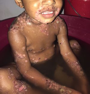 3 year old male child presenting blisters all over the body filled with clear fluid. There was no culture done but the medications he was put on for the lesions don't seem to help. He has had hematuria and positive Nikolsky sign. Currently on amoxicillin 250g and the lesions were drying up until we ran out of supply and it started getting worse again.