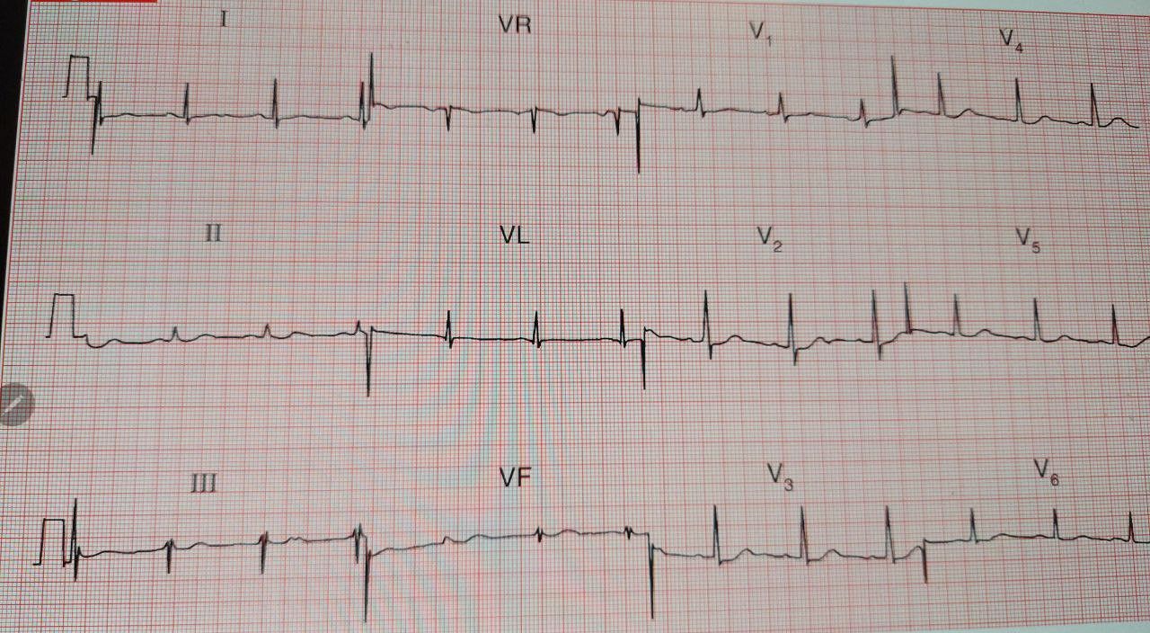 T waves flattening Low voltage What looks like narrow PVCs Really weird