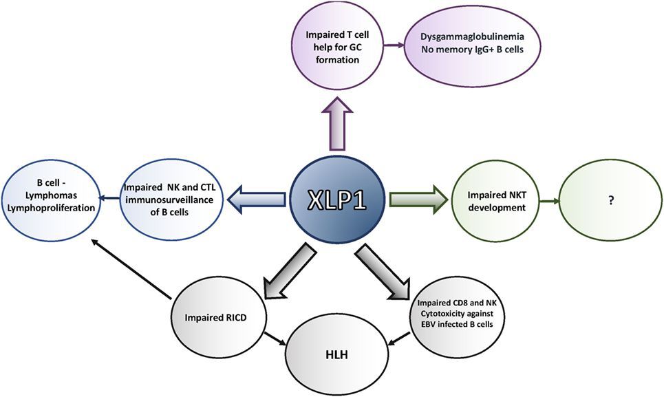Duncan’s Syndrome which is also known as X-linked lymphoproliferative (XLP) syndrome is a rare disorder that have two types: XLP1 and XLP2. XLP1 is the classic XLP that can be characterised as having hemophagocytic lymphohistiocytosis (HLH) or severe mononucleosis, malignant lymphoma, dysgammaglobulinemia, and common variable immunodeficiency (CVID) that is induced by an EBV-infection. The mutation in XLP1 is present in SH2D1A and in XLP2 is caused by the XIAP gene. Text Reference: https://emedicine.medscape.com/article/203780-overview Image Source: https://www.frontiersin.org/files/Articles/332400/fimmu-09-00666-HTML/image_m/fimmu-09-00666-g002.jpg