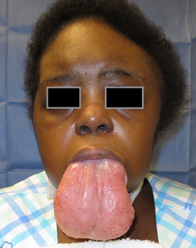 Macroglossia refers to abnormally enlarged tongue. Many diseases are associated with macroglossia. These are: - Lymphangioma - Hemangioma - Acromegaly - Type I diabetes - Congenital hypothyroidism - Beckwith-Wiedmann Syndrome - Trisomy 21 - Amyloidosis - Mucopolysaccharidoses Reference: https://medlineplus.gov/ency/article/002250.htm Image via: https://www.rdhmag.com/patient-care/article/16408148/macroglossia-and-the-disease-implications