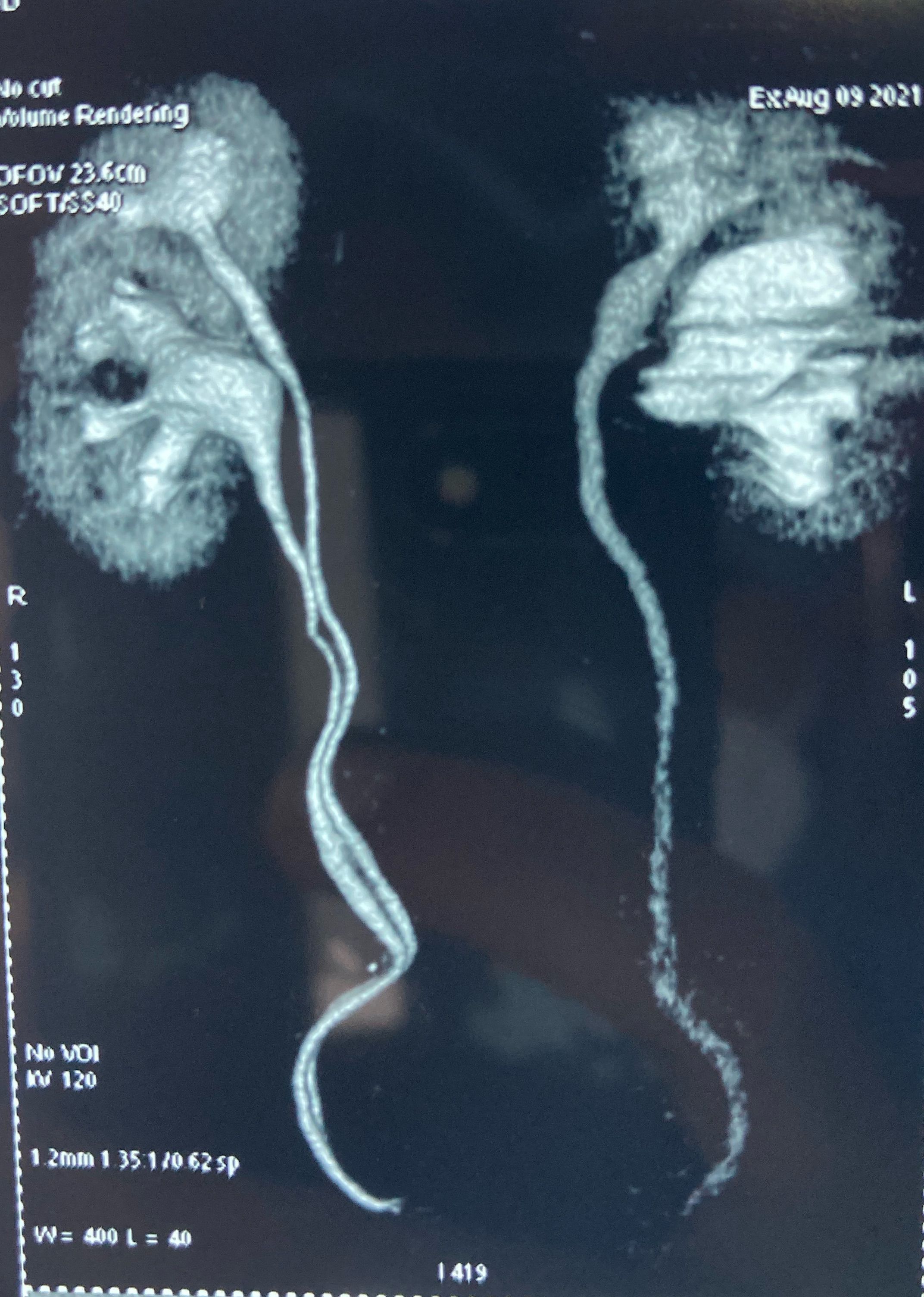 With duplex kidney and complete ureteral duplication, the upper renal and lower renal moieties are drained by separate ureters, each having its own ureteral orifice in the bladder. upper renal moiety ureter has ectopic insertion medial and inferior to the lower renal moiety ureter, and frequently ends in a ureterocele lower renal moiety ureter has orthotopic insertion lateral and superior to the upper renal moiety ureter, and vesicoureteral reflux can occur