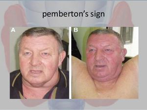The Pemberton maneuver is a physical examination tool used to demonstrate the presence of latent pressure in the thoracic inlet. The maneuver is achieved by having the patient elevate both arms until they touch the sides of the face. A positive Pemberton's sign is marked by the presence of facial congestion and cyanosis, as well as respiratory distress after approximately one minute. Causes A positive Pemberton's sign is indicative ofsuperior vena cava syndrome (SVC), commonly the result of a mass in themediastinum. Although the sign is most commonly described in patients with substernal goiters where the goiter “corks off” the thoracic inlet, the maneuver is potentially useful in any patient with adenopathy, tumor, or fibrosis involving the mediastinum. SVC has been observed as a result of diffuse mediastinal lymphadenopathy of various pathologies such as cystic fibrosis and Castleman’s disease. Park et al. reported enlarged cervical lymph nodes associated with hemophagocytic lymphohistiocytosis as the cause of internal jugular vein compression, which presented clinically similar to SVC syndrome.