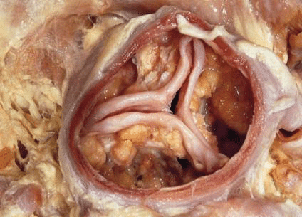 Due to repeated flow of blood across the aortic valve, calcification of the valve can occur. The calcification of the aortic valve is an age-related process. It usually causes symptoms in 8th or 9th decade of life. Reference: https://www.mayoclinic.org/diseases-conditions/aortic-stenosis/symptoms-causes/syc-20353139#:~:text=As%20blood%20repeatedly%20flows%20over,until%20ages%2070%20or%2080. Image via: https://www.researchgate.net/figure/Aortic-Valve-calcification_fig1_8419625