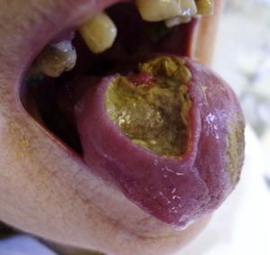 Lingual necrosis caused by mucormycosis in a patient with aplastic anaemia. Mucormycosis is a rare but aggressive fungal infection that predominantly affects immunocompromised. Patients with uncontrolled diabetes mellitus, especially those with ketoacidosis, are at high risk. Other high risk groups include patients with cancer, especially those who are neutropenic and receiving broad-spectrum antibiotics, and individuals receiving immunosuppressive agents, including oral or intravenous steroids and tumor necrosis factor (TNF)-alpha blockers. Successful mucormycosis treatment requires correction of the underlying risk factors, antifungal therapy and aggressive surgery. . . Credit: British Journal of Oral and Maxillofacial Surgery
