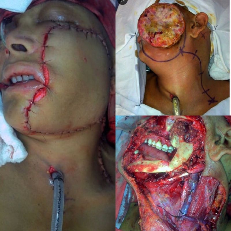 A case of a 37 year old female presented with history of swelling over the left cheek which was rapidly increasing in size and difficulty in opening her mouth for 3 months. On examination there was a 6 x 8 cm swelling over the left cheek which was fluctuant. The swelling later ruptured to form an ulcer as shown on the photo. There was a 3 x 3 cm ulcer in the left buccal mucosa. CT of the neck was done which showed the primary tumor involving left buccal mucosa and skin with ipsilateral involvement of level 1b and 2 lymph node levels. Tumor was resected with segmental mandibulectomy. The gap was closed with a free thigh flap..