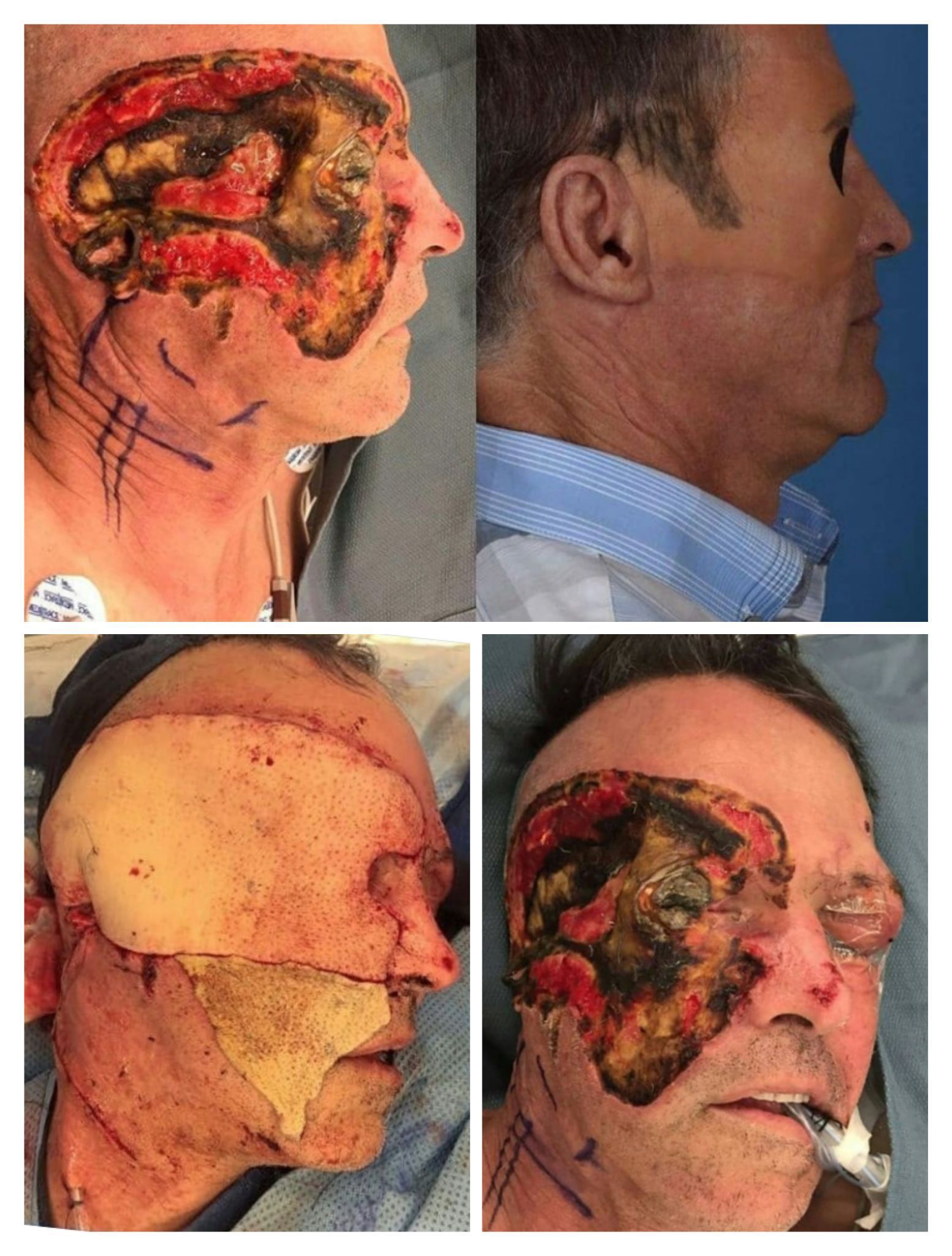 A 56 year old man was admitted to the hospital as a tier III code trauma (GCS of 3). He was hit by an automobile while cycling and was pinned underneath the car resulting in fourth degree burn on the right side of his face as this portion was stuck under the muffler. He also suffered multiple rib fractures, pulmonary recontusion, nasal fracture, and bilateral fracture of iliac wings. For his facial trauma free flap coverage was performed within anterolateral thigh (ALT) flap. He almost completely lost the vision in his right eye, so he required two subsequent surgeries to optimise the contour of the right facial flap. Case by: https://www.instagram.com/p/BgaCqO2nDHx/?utm_medium=copy_link