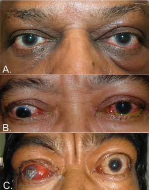 (A) Mild active TED with conjunctival injection and eyelid oedema. (B) Moderate active TED with conjunctival injection, eyelid retraction, chemosis and right eye hypotropia. (C) Severe active TED with corneal ulceration.