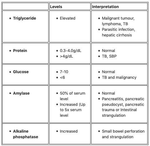 Peritoneal fluid analysis by Paracentesis biochemistry Paracentisis is a minor procedure done to drain ascitic fluid accumulated in the peritoneal cavity. This fluid then can be analysed according to the components present in it as demonstrated in the table. Picture credit: https://litfl.com/peritoneal-fluid-analysis/