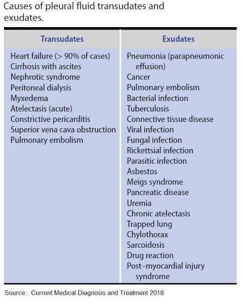 Pleural effusion is the excessive buildup of fluid wishing the pleural cavity. This can be due to various causes. Causes of transudative vs exudative pleural fluid are given in the table. Picture credits: https://www.grepmed.com/images/5315/exudative-differential-fluid-effusion-pleural