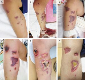 A previously healthy 3-year-old boy presented to a children’s hospital with fever and vomiting. On physical examination, he had small purpura on his legs (Panel A) that spread to his face, abdomen, and limbs during the ensuing 3 hours. Treatment with broad-spectrum antibiotic agents was initiated immediately after blood specimens were obtained for culture. Over the next 6 hours, the purpura enlarged and spread further (Panel B), and signs of septic shock developed. Blood cultures grew Neisseria meningitidis, serotype B, confirming the diagnosis of acute infectious purpura fulminans caused by meningococcemia. Over the next 48 hours, the patient had clinical improvement and some smaller lesions receded, but lesions over the right wrist and right lower leg evolved into well-demarcated bullae with recessed centers (Panel C). Nine days after presentation, the lesions resembled ulcers (Panel D). The patient had difficulty moving his right leg smoothly because of pain and muscle weakness. With treatment, including wound care, the lesions diminished, with granulation tissue present at 3 weeks (Panel E). Four months after presentation, the lesions had epithelialized (Panel F), and the patient regained full range of motion in the leg. Tamae Kugai, M.D. Hidenori Nakagawa, M.D. National Center for Child Health and Development, Tokyo, Japan source: nejm.org