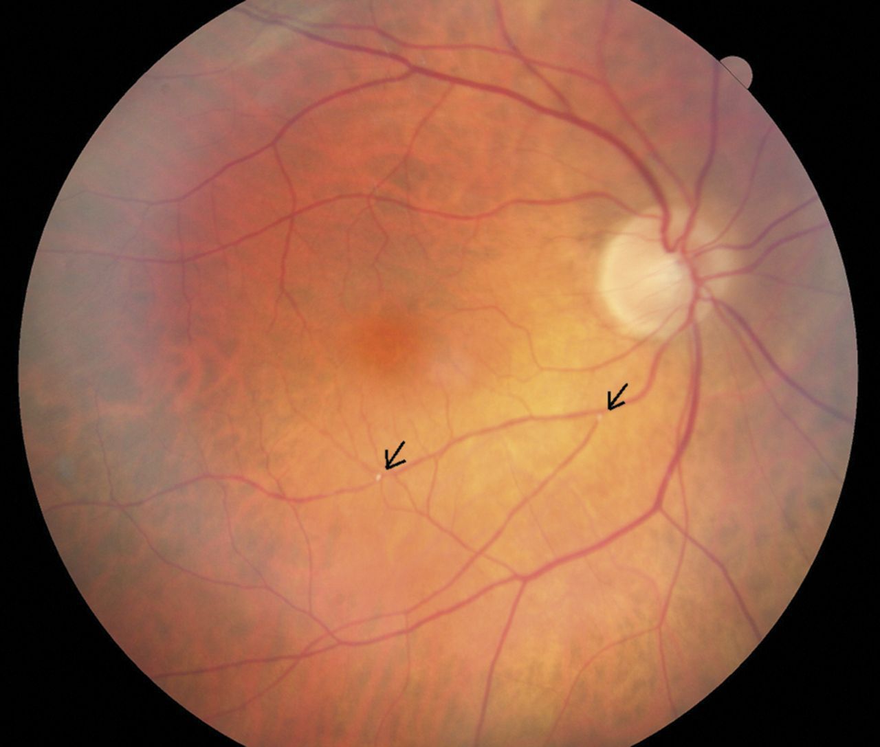 Hollenhorst sign is a clinical sign found on fundoscopy. These fatty plaques can result in retinal artery occlusion. Reference: https://www.ncbi.nlm.nih.gov/books/NBK470445/#:~:text=A%20Hollenhorst%20plaque%20is%20a,of%20its%20branches%20(BRAO). Image via: https://n.neurology.org/content/81/9/e60https://n.neurology.org/content/81/9/e60