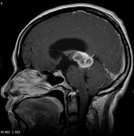 The mass in the pinealoma can be attributed to either pineal parenchymal tumor or germinomas. The pineal mass is usually asymptomatic. However, obstructive hydrocephalus or parinaud syndrome can occur as a result of pineal mass. The pineal mass can cause upward displacement of internal cerebral veins as seen on radiology. Reference: https://radiopaedia.org/articles/pineal-region-mass Image via: https://radiopaedia.org/articles/pineocytoma