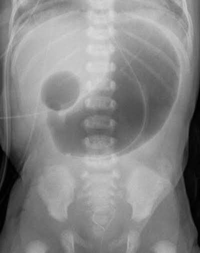 Duodenal atresia is a congenital anomaly of GIT in which the duodenum is malformed. The portion of the duodenum is either absent or completely closed which results in complete obstruction of duodenum. This can be clinically seen on X-ray as a double bubble sign. This sign is formed as a result of distension of stomach and duodenum due to entrapment of air in them. Both the structures are separated by the pyloric sphincter which makes it look like a double bubble on abdominal X-ray. Picture credit: https://en.m.wikipedia.org/wiki/Duodenal_atresia
