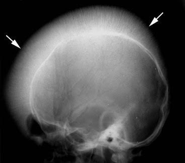 Hair on end sign on X-ray skull is a typical finding seen in cases of chronic hemolysis. This sign is usually seen in cases of blood disorders like thalassaemia and sickle cell anemia. This condition results from the hyperplasia of bone marrow to compensate for the RBCs lost during the process of excessive hemolysis. Picture credit: https://radiologykey.com/bone-marrow-disorders/