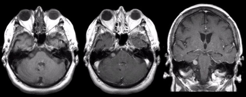 Acoustic neuroma is a benign tumor. It is also known as vestibular schwannoma. The symptoms of acoustic neuroma include dizziness, hearing impairment, tinnitus, and unsteadiness. Reference: https://www.mayoclinic.org/diseases-conditions/acoustic-neuroma/symptoms-causes/syc-20356127 Image via: https://www.mayoclinic.org/diseases-conditions/acoustic-neuroma/symptoms-causes/syc-20356127