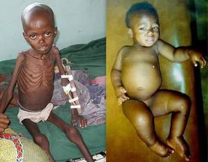 Marasmus is a form of severe malnutrition disorder of protein energy deficiency characterized by loss of weight to less than 60% of the expected body weight for the age, muscle wasting, variable low temperature and so on. Commoner in children less than a year old but may also occur in malnourished adults. Kwashiokor on the other side is malnutrition disorder caused by protein deficiency which presents with most of the symptoms of Marasmus and additional edema. It's more common after 18months of age..