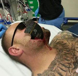 This man was injured as the blade of the angle grinder he was using shattered at high speed. He sustained deep wounds to his right cheek. His wounds were debrided and closed in layers. He recovered well post operatively. Injuries resulting from the use of angle grinders are numerous. The most common sites injured are the head and face. The high speed disc of angle grinders does not respect anatomical boundaries or structures and thus the injuries produced can be disfiguring, permanently disabling or even fatal.