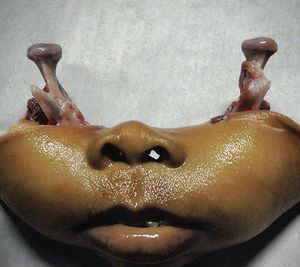Second chapter of our quiz: Here we show you the complete mandible with the attached skin that was avulsed during Swipe for the left to see the upper view of the mandible. And now: are your hipothesis the same or have changed your mind? Coment