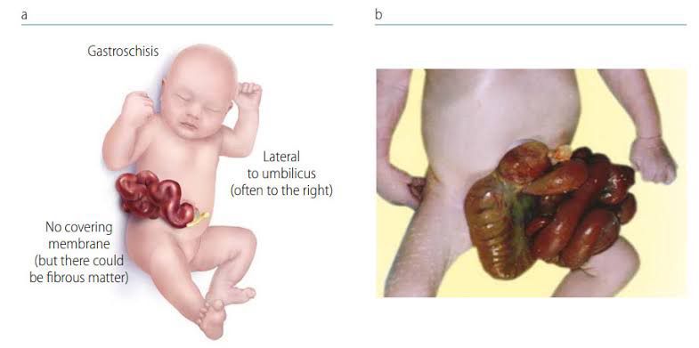 Gastroschisis is a congenital defect of abdominal wall where the contents of abdomen are doing lying outside the abdominal cavity through the defect. The cause of this condition is unknown. This condition is identified by using the ultrasound during the 2nd trimester of pregnancy Treatment is surgical where the contents are placed back inside the cavity and the defect is closed. Picture credit: https://www.cdc.gov/ncbddd/birthdefects/surveillancemanual/quick-reference-handbook/gastroschisis.html