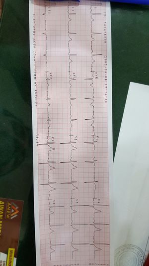 Need to know more about medical history. Is he already admitted to hospital? Is he in ER? Wmeds is this person taking? What are his labs? Do this person have increased potassium. They have peaked T waveI am not a Dr. I'm a ICU nurse but that is the things u would b lookong at.