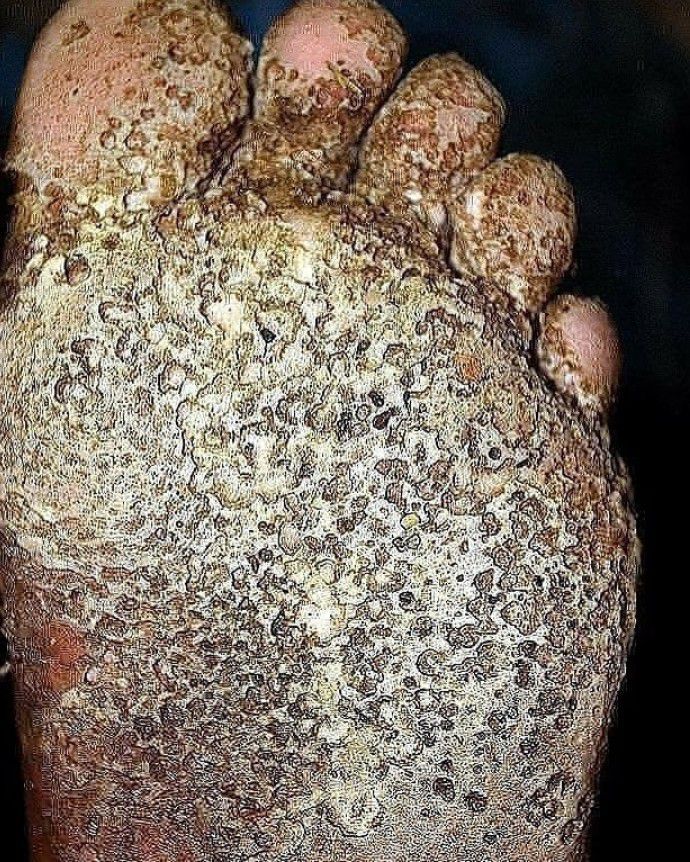 Pitted keratolysis is a bacterial skin infection typically of the soles of the feet. It is characterised by whitish skin with clusters of punched-out pits, and resulting in smelly feet. The bacteria proliferate in moist conditions. The pitting is due to destruction of the stratum corneum by protease enzymes produced by the bacteria.The bad semell is due to sulfur compounds produced by the bacteria. By: https://dermnetnz.org/topics/pitted-keratolysis https://www.instagram.com/p/CTwZMWgsFQZ/?utm_medium=copy_link
