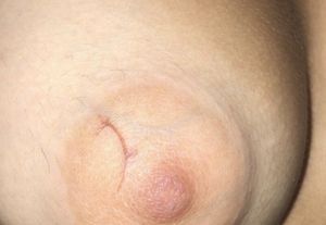 I was once curling my hair with a hot curled while naked and burned my nipple. It looked something like that.