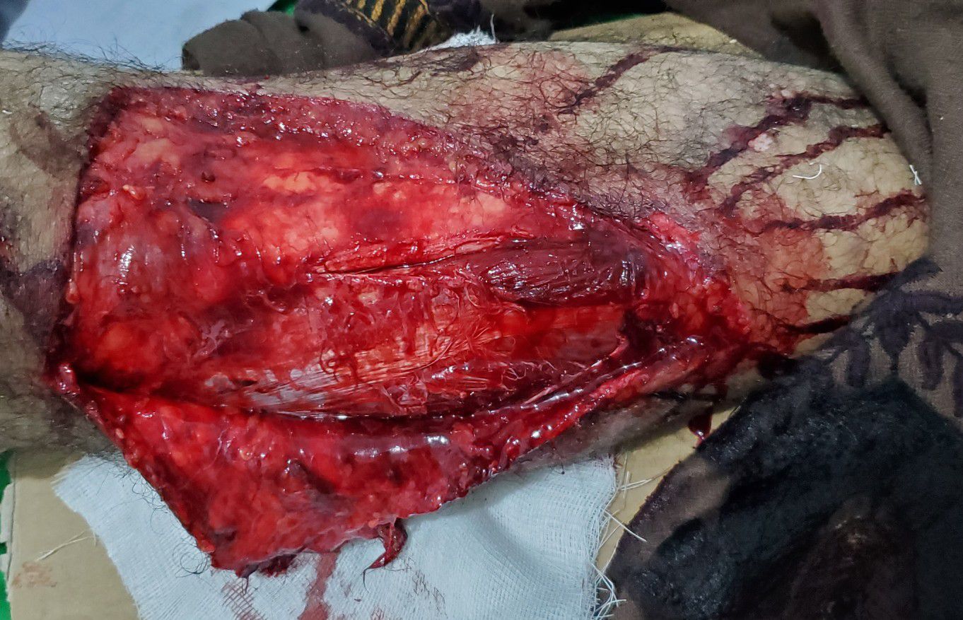This photo was taken in Elite hospital in Sana'a for an Adult male patient after RTA the skin degloving and the muscles compartment of leg was exposed