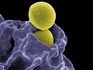 This photo was taken by a scanning electron microscope of a WBC engulfing the bacteria staphylococcus aureus.