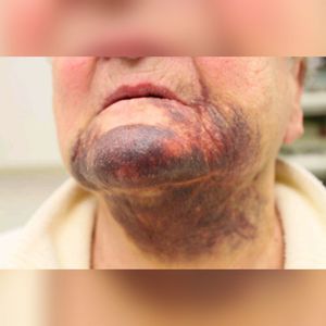 Bruised skin..cause elderly people are much vulnerable to Bruises ..and there is purple discoloration from that we can say that bruise is 2-3 days old