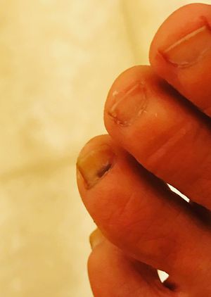 27 y/o female c/o new lesion on her L 4th toenail that she noticed 1 week ago. Family and social hx are unremarkable. She doesn’t recall any trauma and denies hx of indoor tanning. Lesion is asymptomatic. On physical exam there is a violaceous discoloration on the nail plate, however, the pterygium skin and the cuticle are unaffected. Most likely diagnosis ? A. Melanoma B. Melanonychia Striata C. Subungual Hematoma D. Nail matrix nevus