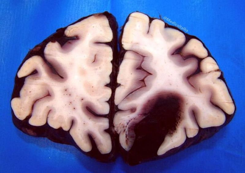 Gross specimen of a brain, frontal section, showing a cerebral hemorrhage (cerebrovascular accident) of the left hemisphere in a patient with hypertension!! There is a large hematoma with mass effect. Hemorrhages involving the basal ganglia area (the putamen in particular) tend to be non-traumatic and caused by hypertension, which damages and weakens the small penetrating branches of the major cerebral arteries. The resulting spontaneous deep intracerebral bleeding caused a mass effect with midline shift, often with secondary edema, may disrupt or compress adjacent brain tissue, leading the neurological dysfunction. Substantial displacement of brain parenchyma may cause elevation of intracranial pressure and potentially fatal herniation syndromes. Nontraumatic intracerebral hemorrhage most commonly results from hypertensive damage to blood vessel walls (eg, hypertension, eclampsia, drug abuse), but it also may be due to autoregulatory dysfunction with excessive cerebral blood flow (eg, reperfusion injury, hemorrhagic transformation), rupture of an aneurysm or arteriovenous malformation, or arteriopathy (eg, cerebral amyloid angiopathy, moyamoya). Nonsurgical management is considered for patients with minimal neurological deficits or with intracerebral hemorrhage volumes less than 10 mL. Surgery is preserved for patients with cerebellar hemorrhage greater than 3 cm, for patients with intracerebral hemorrhage associated with a structural vascular lesion, and for young patients with lobar hemorrhage.