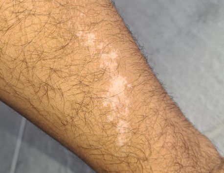 21 year old boy has a hypopigmented rash on his left forearm. It began in high-school but has spread about a 2cm in length in the past few months. He spent alot of time swimming during his high-school. Give the diagnosis, pathophysiology, treatment and complications of the trait.