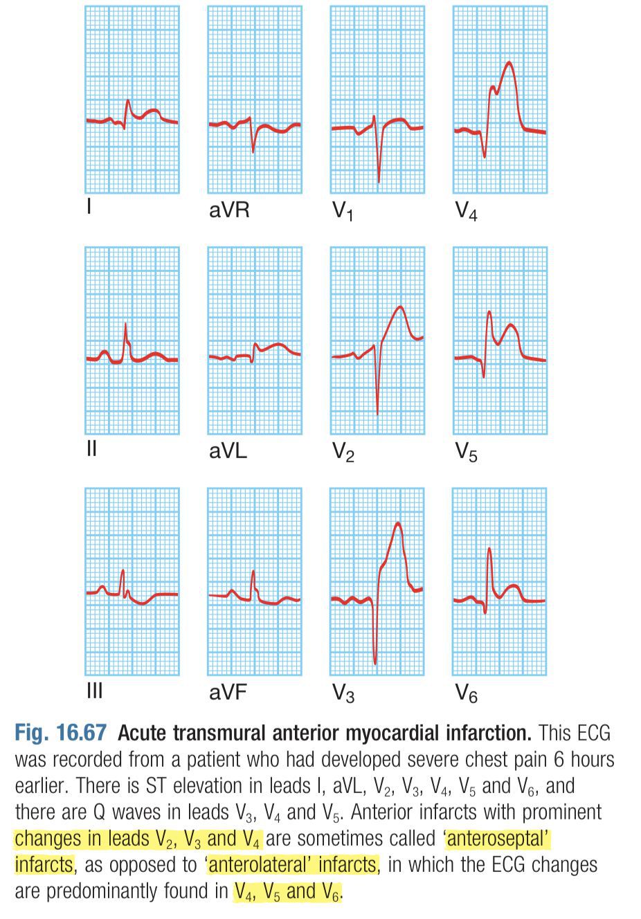 Anterior MI on the basis of EKG lead findings is sometimes distributed into anteroseptal infarcts and anterolateral infarcts. In anteroseptal infarcts, the EKG findings are usually seen in leads V2, V3, and V4 in contrast to anterolateral infarcts that are observed in leads V4, V5, and V6. The above-provided image gives an overview of the EKG picture of an extensive anterior wall MI. Image Source and Text Reference: Davidson’s Principles and Practice of Medicine, 23rd Edition, Page No: 497.