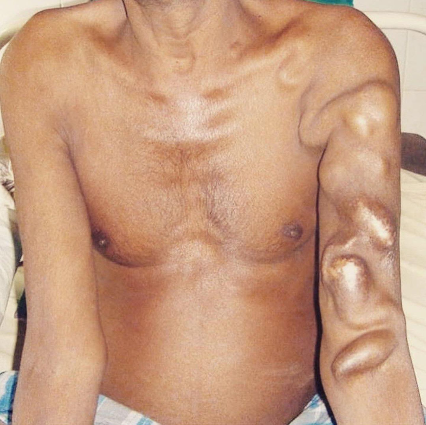 This is a patient suffering from renal failure that is put on regular hemodialysis. In this picture we can see multiple aneurysms of AV fistulas. Hemodialysis fistulas are surgically created communications between the native artery and vein in an extremity. Direct communications are called native arteriovenous fistulas (AVFs). Polytetrafluoroethylene (PTFE) and other materials (Dacron, polyurethane, bovine vessels, saphenous veins) are used or have been used as a communication medium between the artery and the vein and are termed prosthetic hemodialysis access arteriovenous grafts (AVGs). The access that is created is routinely used for hemodialysis 2-5 times per week.