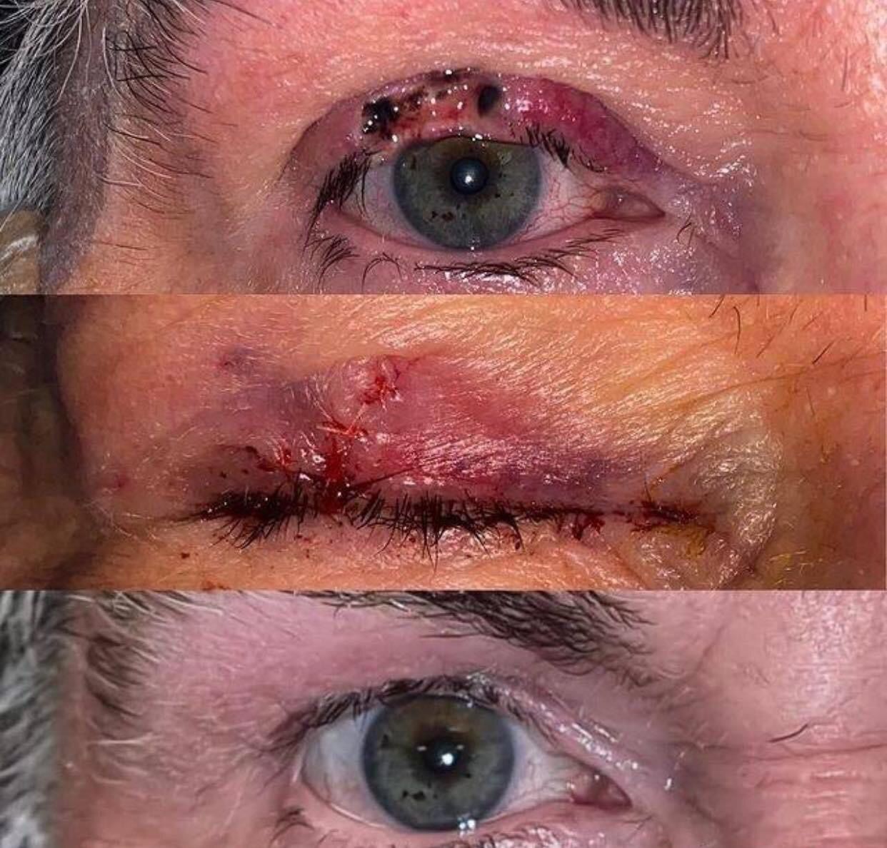 The incredible healing power of eyelids. - Top picture is post basal cell carcinoma (BCC). - Middle picture shows immediate reaction after reconstruction. - Bottom most is after 8 months. There is no noticeable scar formation anywhere with eyes open or closed, and the lashes are continuous (result of direct lid closure and eventual stretching of tissues).
