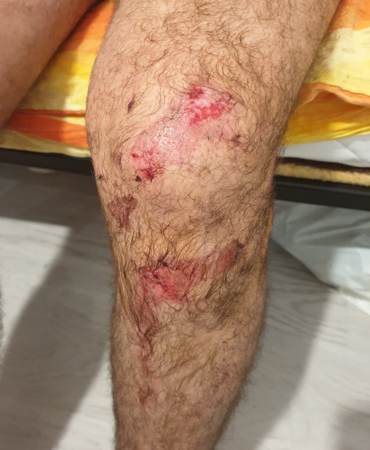 Patient, 21 years old, presented to the emergency room after a motorcycle accident. He presented superficial skin injuries in the left knee area, at the right hand and in the in the upper left hip area. The cervical spine was intact. Glasgow Coma Score was 14. The CT-scan of the head, thorax, abdomen and pelvis didn't present any pathological modifications. The CBC was normal, except the oxygen and oxygen saturation in blood (decreased) and carbon monoxide in blood (increased), caused maybe by hyperventilation and psychological shock.